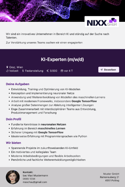 Eine Stellenanzeige wird entworfen und unter einer neuen Adresse im Internet veröffentlicht.